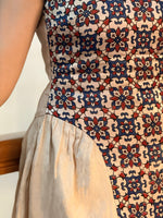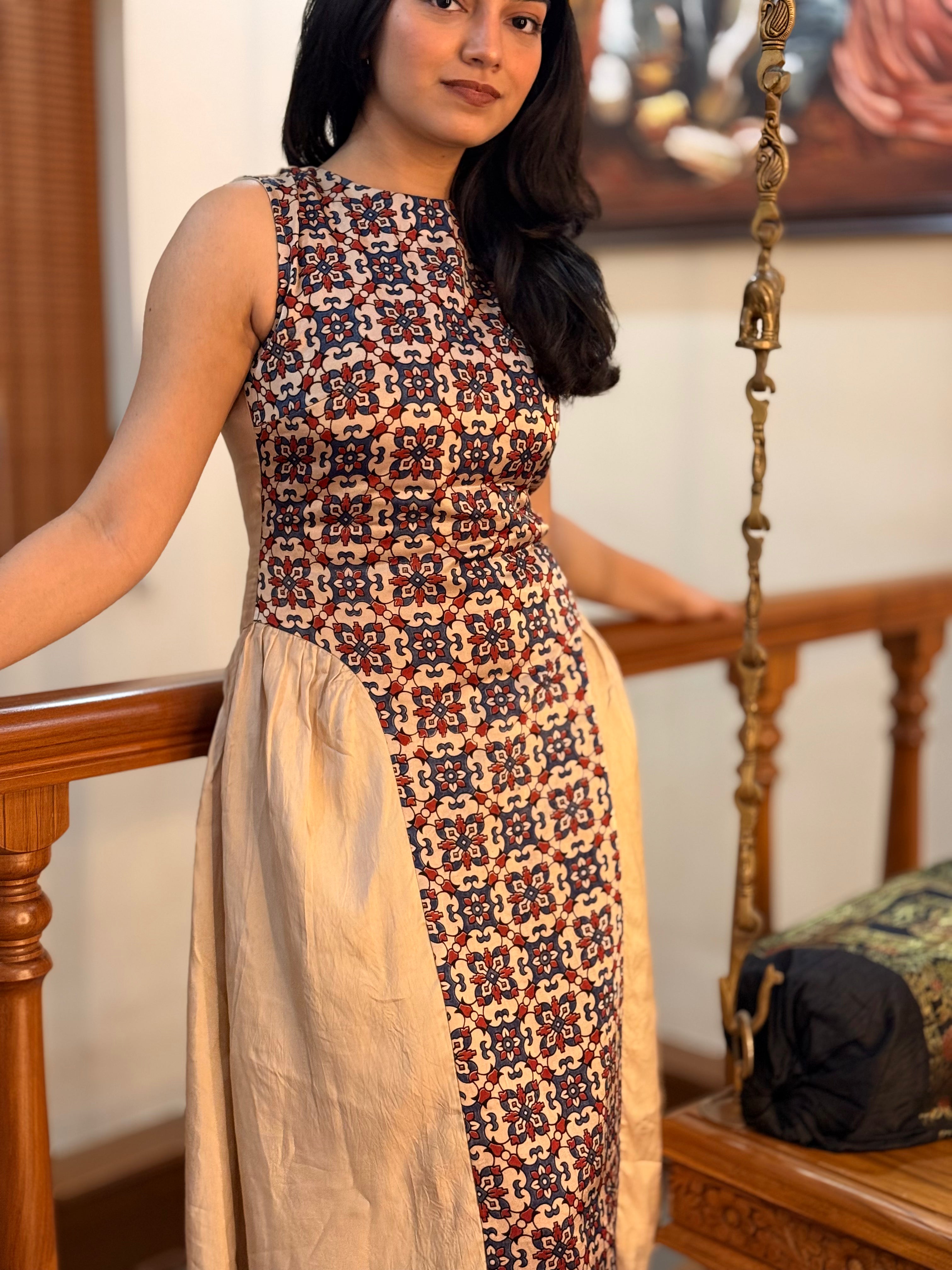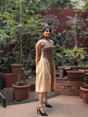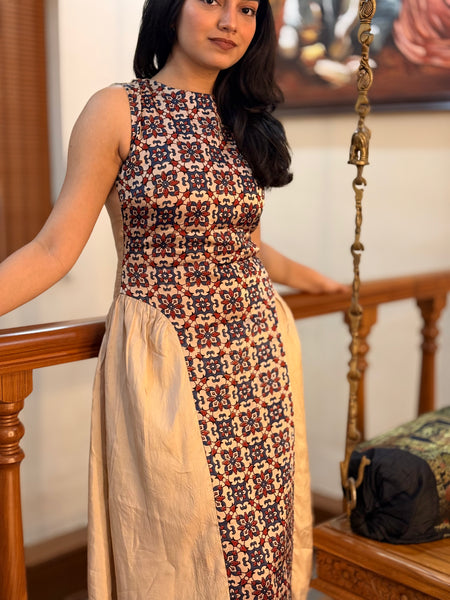 Sleeveless, high neckline with fitted Ajrakh bodice
