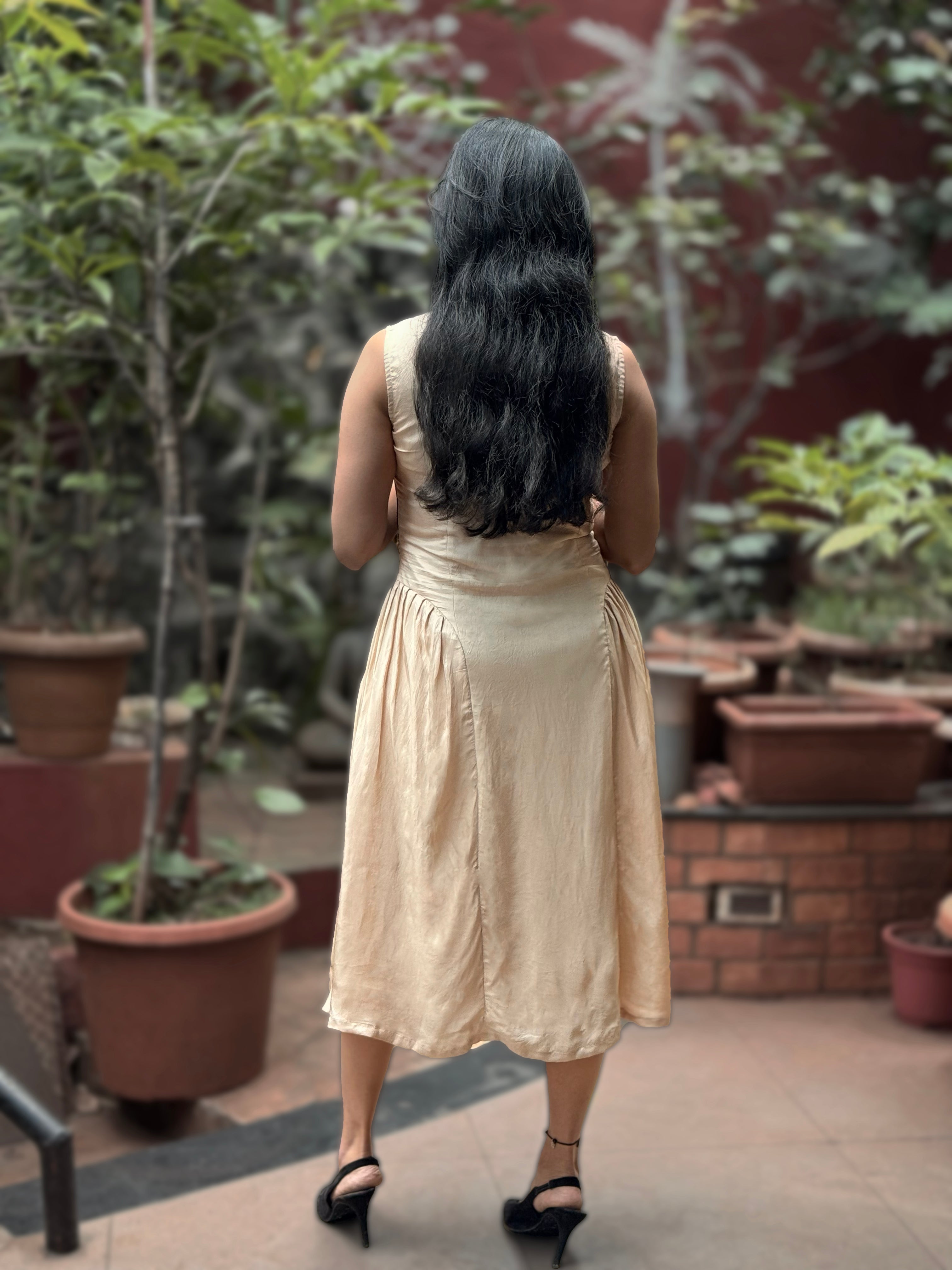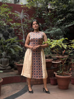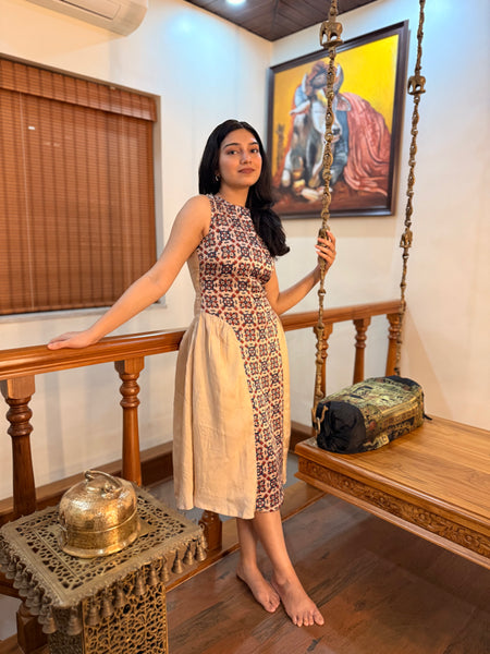 The Saara Midi Dress blends the timeless geometry of Ajrakh with the fluid sheen of Habutai silk. A fitted bodice in Ajrakh silk flows into softly gathered champagne panels, creating a flattering silhouette that moves gracefully with you. Sleeveless, elegant, and versatile, it’s the dress you’ll reach for whether you’re lighting diyas at home or hosting a festive dinner.