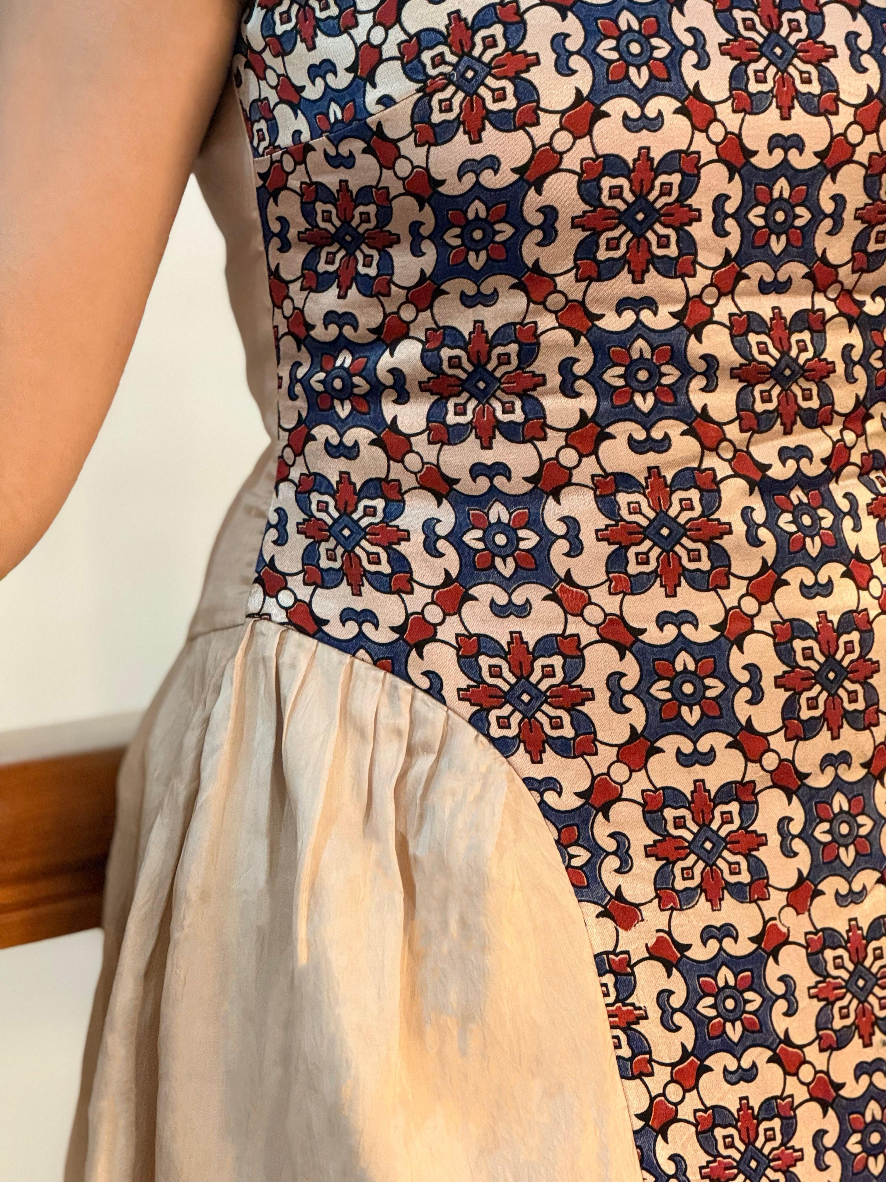 Craft: Ajrakh motifs hand-transferred on silk, paired with solid silk panels